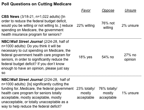 While pollsters ask about potential changes to Medicare in various ways, their most straightforward questions are about potential budget cuts. The table below features responses to three questions asked about the popular program in recent months. The national surveys show majorities, ranging between 54 and 76 percent of adults, reject the notion of cuts to Medicare: